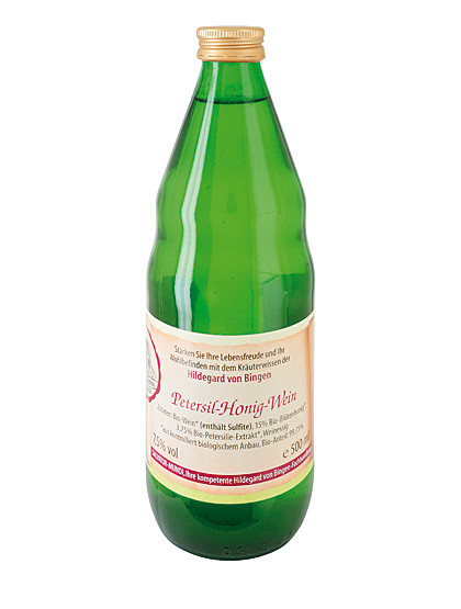 Dieser Kräuterwein ist eine wahre Wohltat für das Herz. Bei Hildegard steht geschrieben: "Wer im Herzen oder in der Milz oder in der Seite Schmerzen leidet, der koche Petersilie in Wein unter Zugabe von etwas Weinessig und reichlich Honig und seihe durch ein Tuch ab. Den so zubereiteten Herz-Wein trinke er oft, und es heilt ihn."