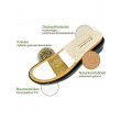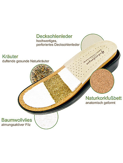 Die Herrenpantolette aus hochwertigen Nubukleder (dunkel blau) mit Kräuterfußbett, enthält eine fein abgestimmte Kräutermischung, die mit ihren ätherischen Ölen rundum beruhigend auf den Organismus wirkt. Durch die natürliche Gehbewegung sowie die Fußwärme aktiviert und gibt seine wohltuende Wirkung gut dosiert an die Füße ab. Durch den perforierten Lederüberzug gelangen die ätherischen Öle der Kräuter bis an die Füße, was sich positiv auf Ihre Leistungsfähigkeit und auf Ihr Wohlbefinden auswirken kann. Der Schuh lässt sich mit 2 verstellbaren Schnallen optimal am Fuß anpassen. Gefüttert, Kork-Fußbett mit Kräutereinlage, stoßdämpfende Gummilaufsohle, Absatzhöhe 25 mm, bitte geben Sie ihre gewünschte Größe an. Lieferbar in Größe 39 – 46. - Zusatzinformation