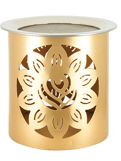 In goldfärbig, mit eingearbeiteten Blumenmotiv, kann dieses Gefäß aus Metall als Räucherstövchen und Duftlampe verwendet werden – eine schöne Zierde!