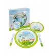 Ein liebevoll gestaltetes 5-teiliges Kinder-Essgeschirrset aus Melamin, bestehend aus Teller, Schüssel, Trinkbecher, Gabel und Löffel. Wird in einer Geschenkverpackung geliefert.