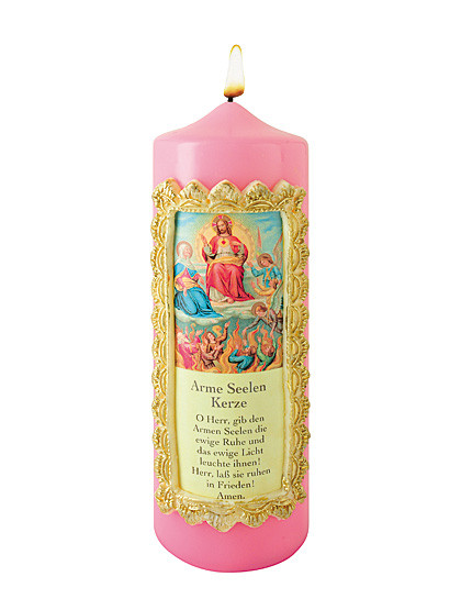 Arme Seelen-Kerze, 7 x 20 cm, Farbbild eines Herz-Jesu-Altares mit Arme-Seelen-Gebet, montiert mit einem färbigen Echtwachsrahmen. Die Kerze ist aus bestem Qualitätswachs und besitzt daher eine besonders lange Brenndauer, Handarbeit. Diese Kerze eignet sich bestens als Geschenk für viele Anlässe.
