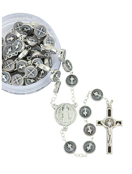 Benediktus-Rosenkranz aus Metall mit Perlen in Medaillenform und Kreuz mit Emaille-Einlage. Wird in einer transparenten Rosenkranzschatulle geliefert, Länge: 58 cm.