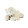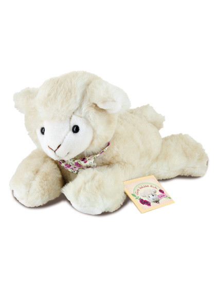 Liegendes Schäfchen "Lina" aus flauschig weichem Plüsch, mit buntem Halstuch, Länge 22 cm, handwaschbar bei 30°C, mit Geschenkanhänger.