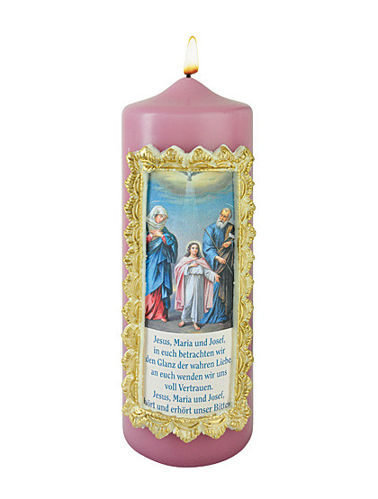 Eine besonders schöne Darstellung der Heiligen Familie ziert diese Kerze. Mit einen Barockrahmen veredelt und aus bestem Qualitätswachs hat sie eine lange Brenndauer.