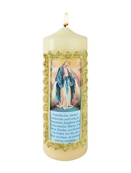 Die Maria Empfängnis-Kerze erinnert uns an die fürsorgliche Muttergottes, die auch uns unterstützt, tröstet und begleitet. Lange Brenndauer, 7 x 20 cm.
