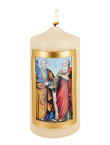 „Petrus und Paulus-Kerze“, ihr Gedenktag ist der 29. Juni, 15 x 7 cm.