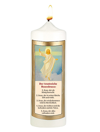 Unsere schön gestalteten Kerzen sind gute Begleiter für das betrachtende Gebet, besonders für den Rosenkranz in seinen verschiedenen Formen. Aus bestem Qualitätswachs mit langer Brenndauer! 7 x 20 cm.
