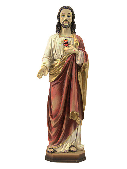 Diese berührende Herz Jesu-Statue wurde liebevoll und sorgfältig mit der Hand bemalt. Schenken Sie ihr einen Platz auf dem Hausaltar. Höhe: 20 cm, aus Kunstharz.