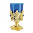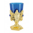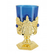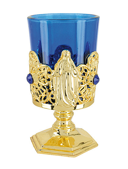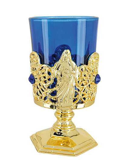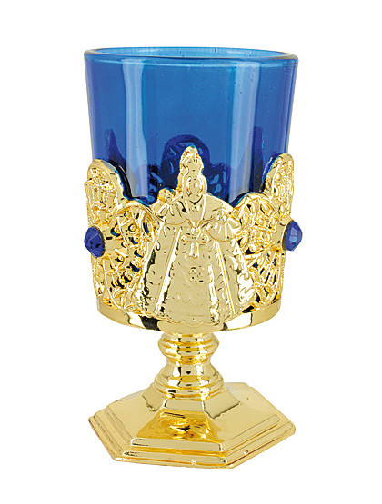 Der goldene Votivleuchter aus Metall ist rund herum mit blauen Kunststeinen verziert und zeigt auf einer Seite Jesu und sein Göttliches Herz, auf der anderen die Jungfrau Maria und das Prager Jesulein. Der Zierkelch mit feuerfesten Glaseinsatz ist vielseitig einsetzbar; ob als Kerzenständer, Weihwasserkessel, Weihrauchspender, Blumenvase… er verdient sich einen Platz auf Ihrem Hausaltar!
