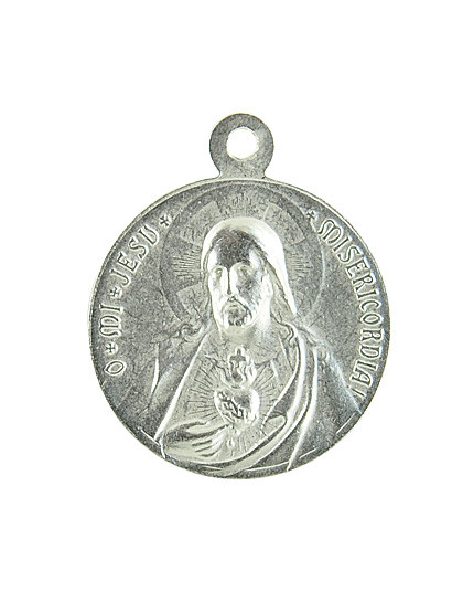 Auf der Jungfrau von Fatima-Medaille ist auf der Rückseite das Göttliche Herz Jesu. Alpaka, Ø 2 cm.