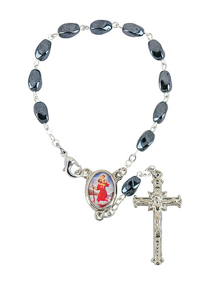 Hl. Christophorus-Armband (10er Rosenkranz) aus poliertem Hämatit (Blutstein). Auf jeder Reise, im Auto, am Handgelenk… zu empfehlen! Mit Schließe, Länge:16 cm.
