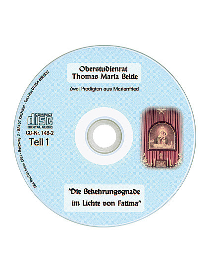 „Die Bekehrungsgnade im Lichte von Fatima“ – Diese Doppel-CD erscheint gerade recht zum 100jährigen Jubiläum von Fatima. Diese 2 Predigten aus Marienfried von Oberstudienrat Thomas Maria Beltle beleuchten dieses Ereignis auf besonders anschauliche Weise. - Zusatzinformation