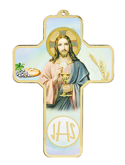Erstkommunion-Kreuz, das den Heiland mit dem Sakrament der hl. Kommunion zeigt. Mit einem Loch zum Aufhängen, Laminat auf Holz, Größe 8 x 13 cm.