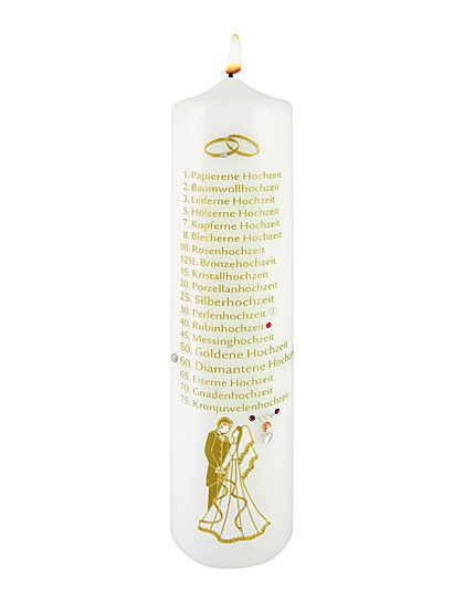 Diese prachtvolle Hochzeitskerze ist ein schönes Geschenk für alle Hochzeitspaare, ob sie nun den ersten Hochzeitstag oder das 75. Jubiläum feiern! Mit Schmucksteinen und Perlen verziert, eine wunderschöne Handarbeit, die viel Freude, aber auch Würde vermittelt. Durchmesser 6 cm, Höhe 25 cm, kommt in stabiler Verpackung mit Klarsichtdeckel.