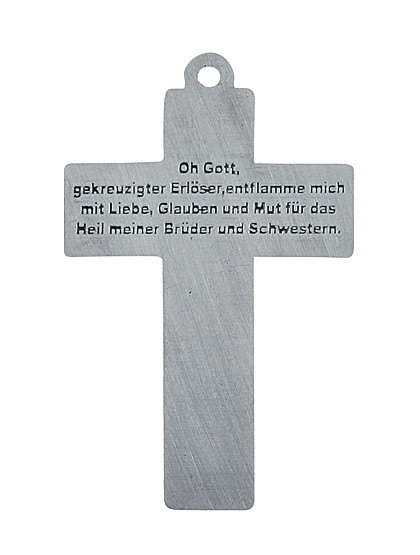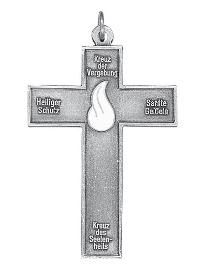 Kreuz der Vergebung mit Altsilber-Patinierung und mit einer weißen Flamme aus Email, 4 x 2,8 cm. - Zusatzinformation