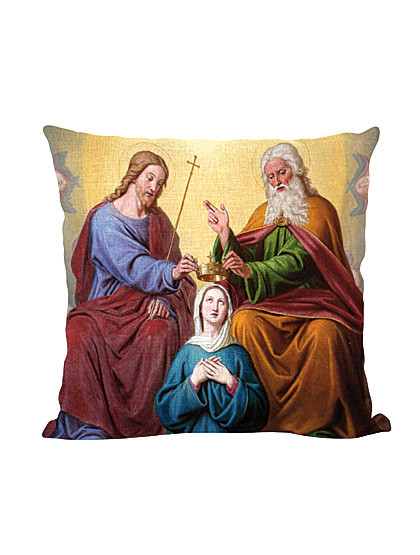 Dieser Zierkissen-Bezug zeigt uns die Aufnahme und die Krönung Mariens im Himmel! Mit verdecktem Reißverschluss, in edler Leinenoptik, waschbar bei 30 Grad, 45 x 45 cm.
