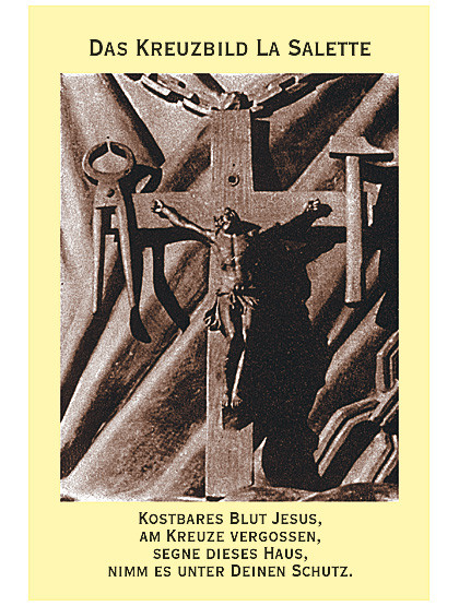 „La Salette-Gebetsbild“ – Dieses Gebetsbild zeigt das Kreuzbild von La Salette mit einer genauen Erklärung und Gebeten. 10 Stück.