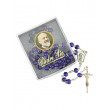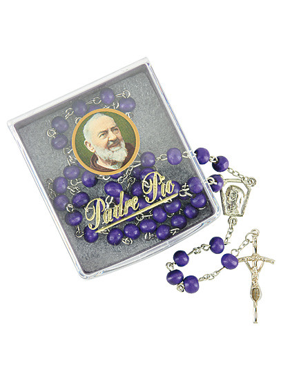 Der gekettelte, violette Pater Pio-Rosenkranz duftet zart nach Rosen und ist das ideale Geschenk für jeden Verehrer des Heiligen, dessen Gedenktag der 23. September ist. Das Zwischenstück zeigt ebenso wie die mitgelieferte Rosenkranzdose sein Gesicht. Länge: 49 cm (5 x 10 Perlen).