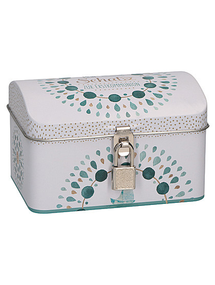Die kleine „Schatzkiste zur hl. Kommunion“ enthält eine Vielzahl an Geschenken, die Kinder lieben. Metalldose, 7,5 x 14,5 x 9,5 cm.